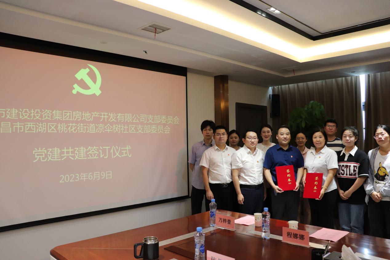 为起劲探索立异党建事情新模式,,,,,,,,探索团结党建新路径,,,,,,,,起劲形成组织共建、资源共享、生长共商的党建事情新时势,,,,,,,,6月9日,,,,,,,,南昌市建设投资集团房地产开发有限公司党支部与南昌市西湖区桃花街道凉伞树社区党支部举行了党建共建签约仪式。。。。。公司党支部委员、总司理万勇林,,,,,,,,党支部委员、副总司理何强科,,,,,,,,总司理助理吴瑞雪、手艺照料陈保福出席,,,,,,,,双方单位共16名党员加入。。。。。