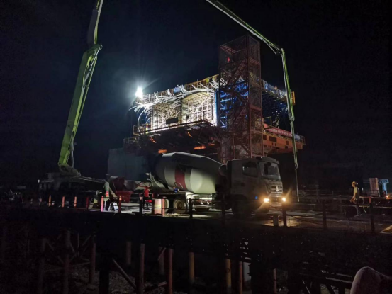 据项目认真人先容,,,,,,,,此次浇筑完成的标段最大跨度60+2*90+60米一连箱梁右幅83号主墩0号块,,,,,,,,长12米、高5.5米,,,,,,,,宽16.55米,,,,,,,,混凝土使用方量为433.6立方米,,,,,,,,接纳支架现浇的施工工艺,,,,,,,,施工历程中保存浇筑难度大、施工时间长、清静危害高等情形。。。。。。。。该一连梁“0号块”顺遂浇筑完成,,,,,,,,标记着东阳特大桥转入上部结构施工阶段。。。。。。。。为了确保此次一连梁0号块顺遂浇筑,,,,,,,,在南昌市非凡国际集团的统一安排下,,,,,,,,施工单位全心组织,,,,,,,,多次举行施工手艺交底,,,,,,,,明确从支架搭设到模板装置、钢筋帮扎等各个工序、环节的手艺规程和操作规范,,,,,,,,确保浇筑历程中的清静质量有序可控。。。。。。。。