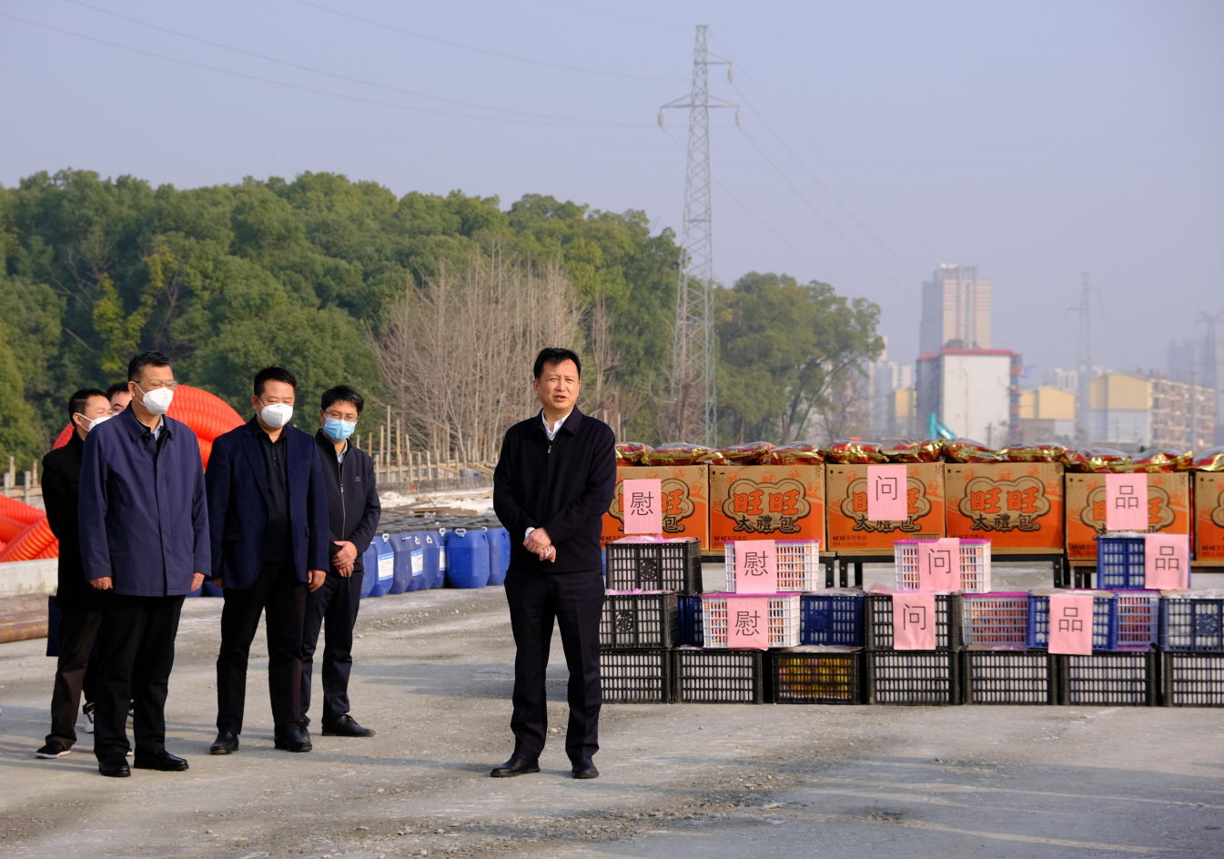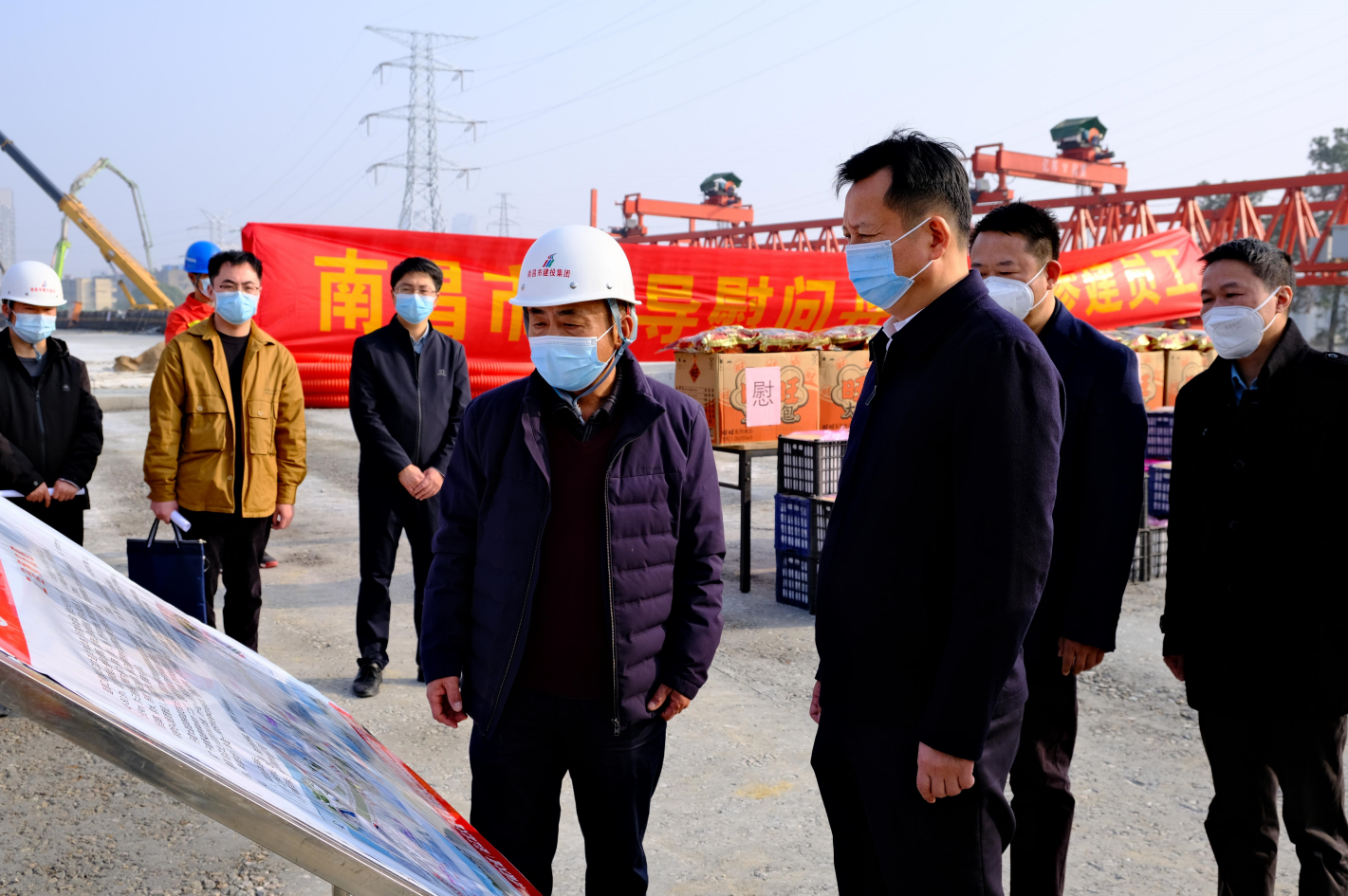 春节来临之际,,,,,1月10日下昼,,,,,市委常委、副市长肖云走访慰问丹霞路蹊径及综合管廊项目现场一线工人,,,,,并观察项目建设希望情形,,,,,市公建中心主任熊伟、市住建局副局长池建林、市非凡国际集团副总司理罗辉陪同。。。。。。。